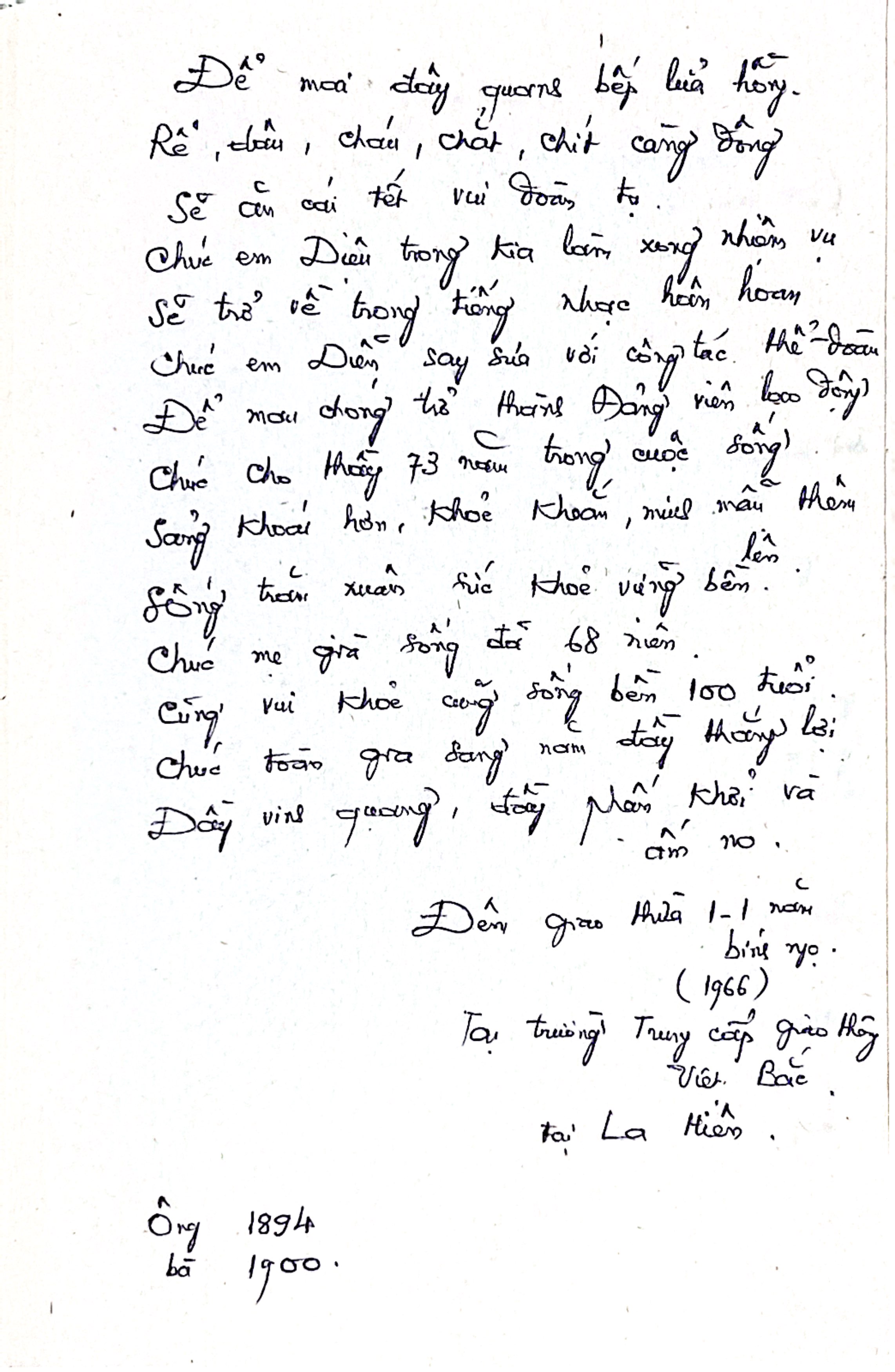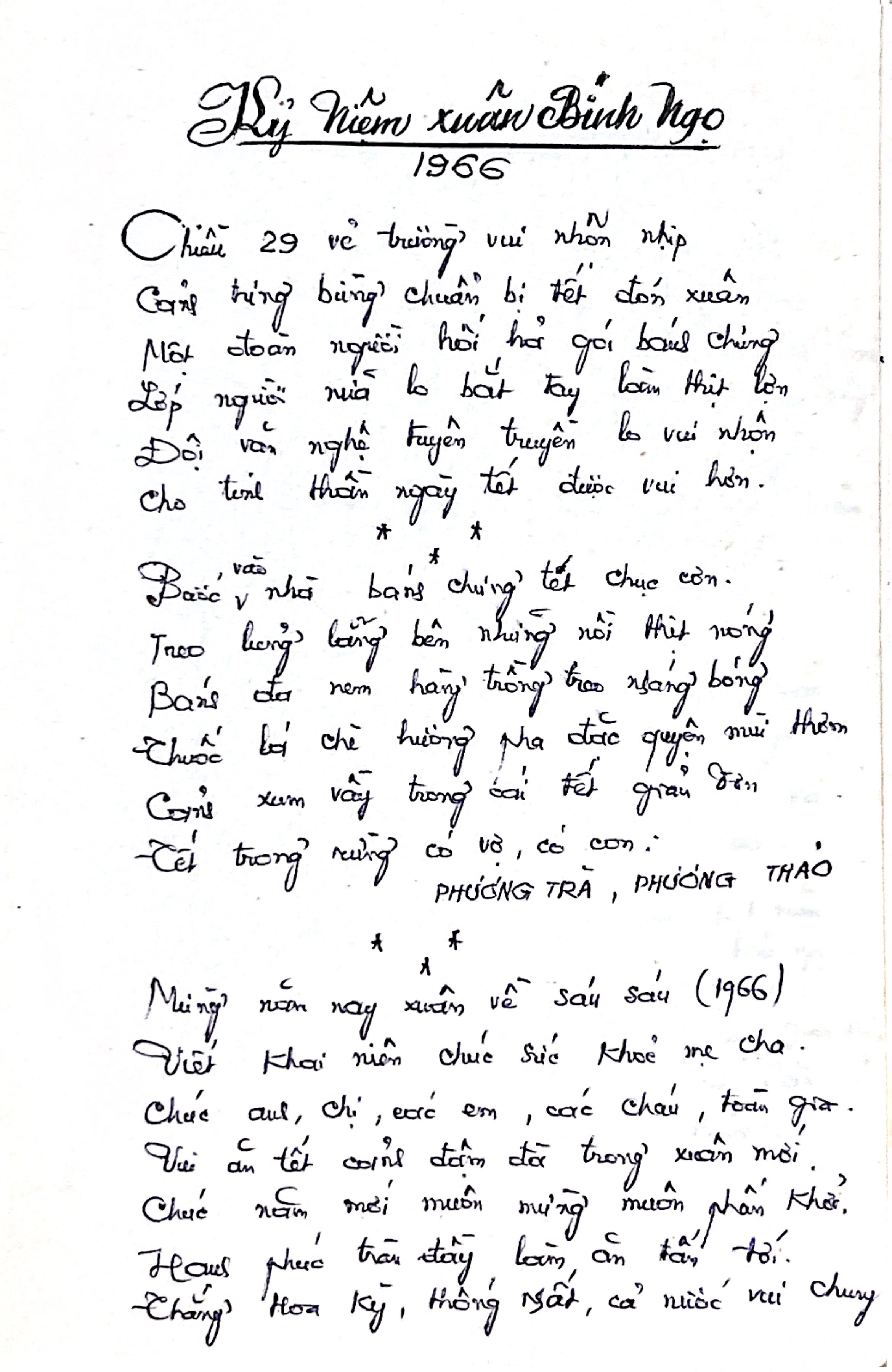 Chiều 29 vẻ trường vui nhộn nhịp Cảnh tưng bừng chuẩn bị tết đón xuân Một đoàn người hối hả gói bánh chưng Lớp người nữa lo bắt tay làm thịt lợn Đội văn nghệ tuyên truyền lo vui nhộn Cho tinh thần ngày Tết được vui hơn. * * * Bước vào nhà bánh chưng Tết chục cơn. Treo lủng lẳng bên những nồi thịt nóng Bánh đa nem hàng chồng treo sáng bóng Thuốc lá chè hương pha đặc quyện mùi hương Cảnh xum vầy trong cái Tết giản đơn. Tết trông rừng có vợ, có con (PHƯƠNG TRÀ, PHƯƠNG THẢO) * * * Mừng năm nay xuân về sáu sáu (1966) Viết khai niên chúc sức khỏe mẹ cha. Chúc anh, chị, các em, các cháu, toàn gia. Vui ăn tết cảnh đậm đà trong xuân mới. Chúc năm mới muôn mừng muôn phấn khởi. Hạnh phúc tràn đầy, làm ăn tấn tới. Thắng Hoa Kỳ, thống nhất, cả nước vui chung. * * * Để mai đây quanh bếp lửa hồng. Rể, dâu, cháu, chắt, chít càng đông Sẽ ăn cái tết vui đoàn tụ. Chúc em Diệu trong kia làm xong nhiệm vụ Sẽ trở về trong tiếng nhạc hân hoan Chúc em Diễn say sưa với công tác thể đoàn Để mau chóng trở thành Đảng viên lao động Chúc cho Thầy 73 năm trong cuộc sống Sảng khoái hơn, khoẻ khoắn, minh mẫn thêm Sống trăm xuân, sức khoẻ vững bền. Chúc mẹ già sống đã 68 năm Cũng vui khoẻ cùng sống bền 100 tuổi. Chúc toàn gia sang năm đầy thắng lợi Đầy vinh quang, đầy phấn khởi và ấm no. Đến giao thừa 1-1 năm Bính Ngọ (1966) Tại trường Trung cấp giao thông Việt Bắc ở La Hiên. Ông 1894 Bà 1900