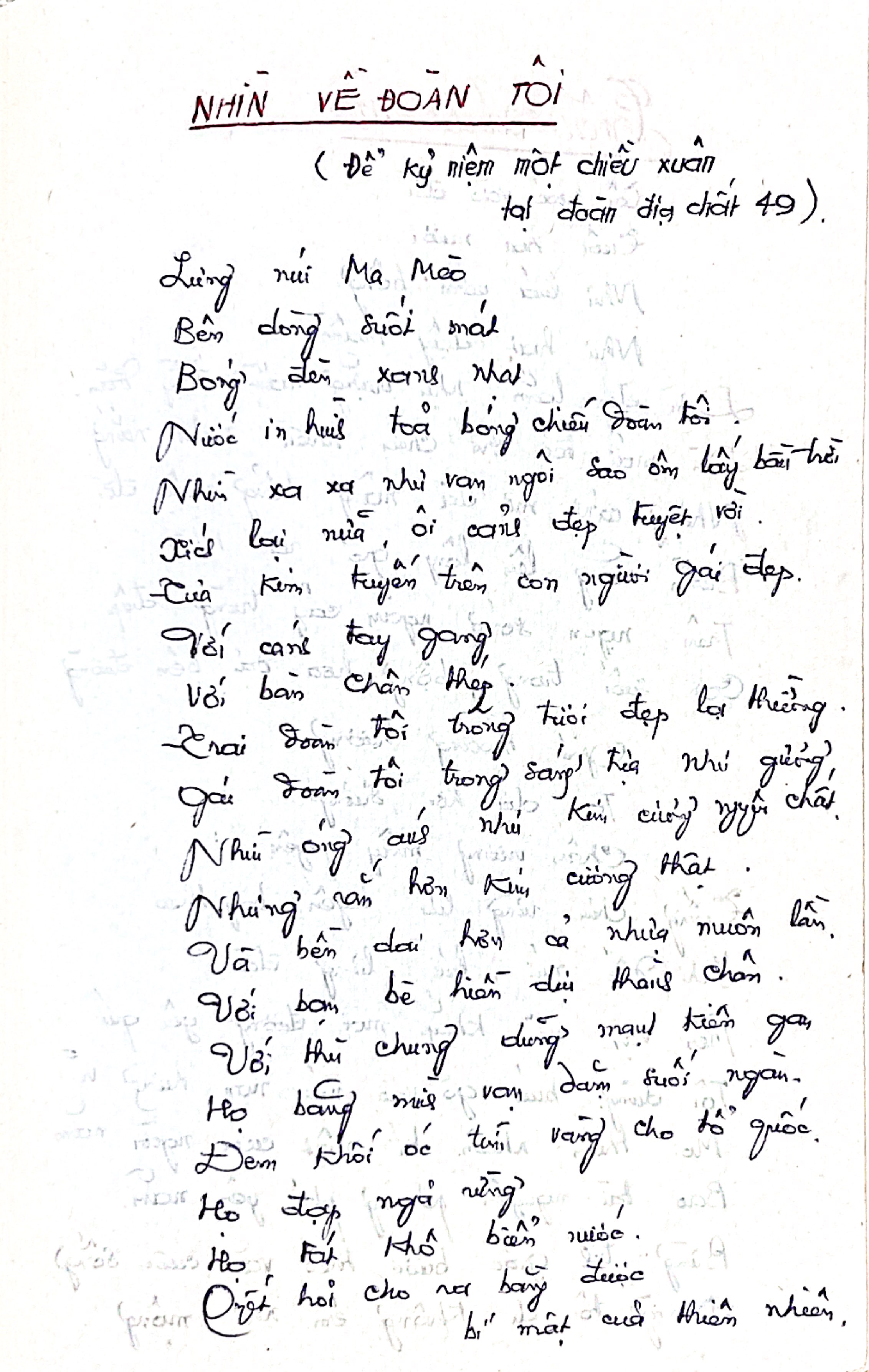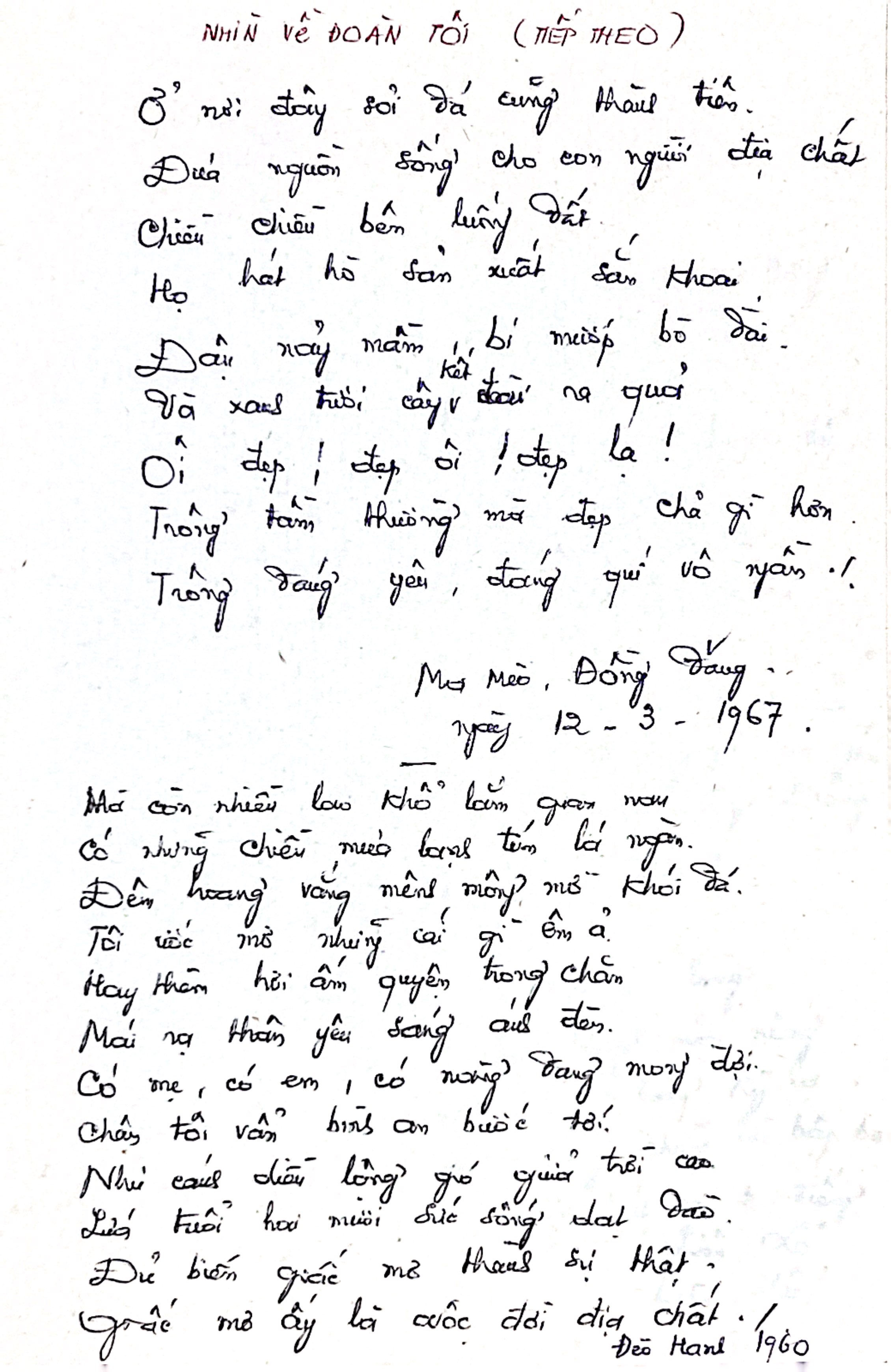NHÌN VỀ ĐOÀN TÔI ( Để kỷ niệm một chiều xuân tại đoàn địa chất 49). Lưng núi Ma Mèo Bên dòng suối mát Bóng đèn xanh nhạt Nước in hình toả bóng chiếu đoàn tôi. Nhìn xa xa như vạn ngôi sao ôm lấy bầu trời Xích lại nữa, ôi cảnh đẹp tuyệt vời. Tựa kim tuyến trên con người gái đẹp. Với cánh tay gang Với bàn chân thép Trai đoàn tôi trông tươi đẹp lạ thường. Gái đoàn tôi trong sáng, tựa như gương, Nhìn óng ánh như Kim cương thật. Nhưng rắn hơn Kim cương thật. Và bền dai hơn cả nhựa muôn lần. Với bạn bè hiền dịu thành chân Với thù chung dũng mãnh kiên gai, Họ băng mình vạn dặm suối ngàn. Đem khối óc tìm vàng cho tổ quốc. Họ đạp ngã rừng Họ tát khô biển nước. Quyết hỏi cho ra bằng được bí mật của thiên nhiên, --- NHÌN VỀ ĐOÀN TÔI (TIẾP THEO) Ở nơi đây sỏi đá cũng thành tiên, Đưa nguồn sống cho người địa chất Chiều chiều bên luống đất Họ hát hò sản xuất sản khoai. Đậu nảy mầm, bí mướp bò dài Và xanh tươi cây kết trái ra quả, Ôi đẹp! Đẹp ôi! Đẹp lạ! Trông tầm thường mà đẹp chả gì hơn. Trông đáng yêu, đáng quý vô ngần! Ma Mèo, Đồng Đăng Ngày 12 - 3 - 1967. Mà còn nhiều lao khổ lắm gian nan Có những chiều mưa lạnh tím lá ngàn. Đêm hoang vắng mênh mông mờ khói đá. Tôi ước mơ những cái gì êm ả Hay thèm hơi ấm quyện trong chăn Mái rạ thân yêu sáng ánh đèn. Có mẹ, có em, có nàng đang mong đợi. Chân tôi vẫn bình an bước tới. Như cánh diều lộng gió giữa trời cao Lứa tuổi hai mươi sức sống dạt đào. Đủ biến giấc mơ thành sự thật. Giấc mơ ấy là cuộc đời địa chất./ Đèo Hanh 1960