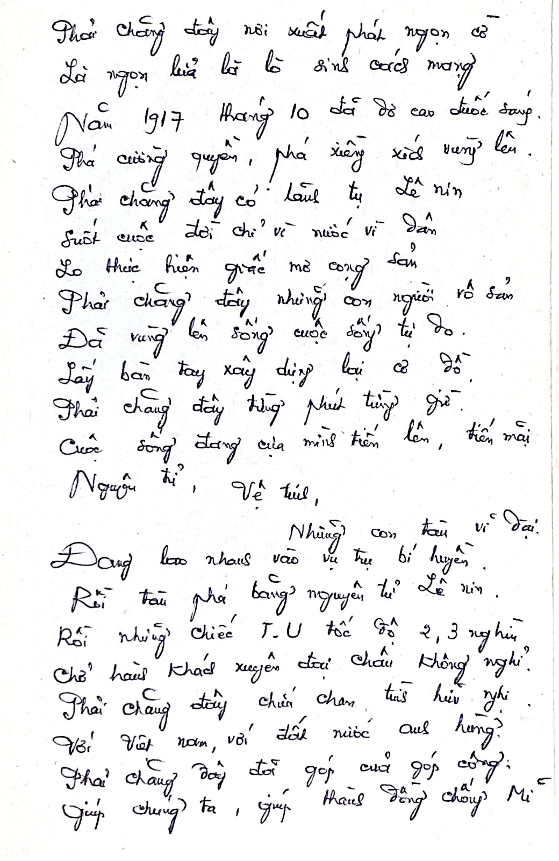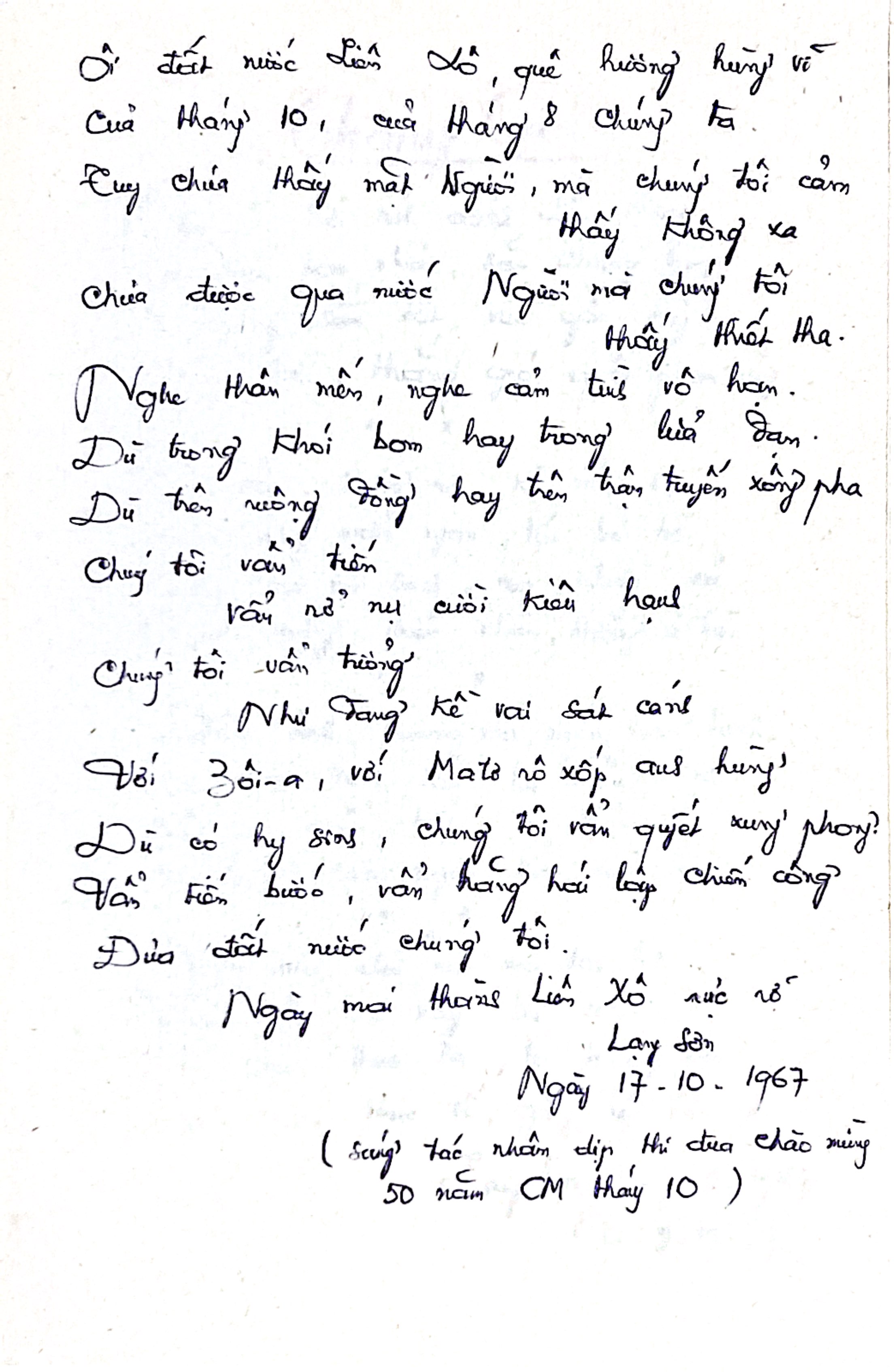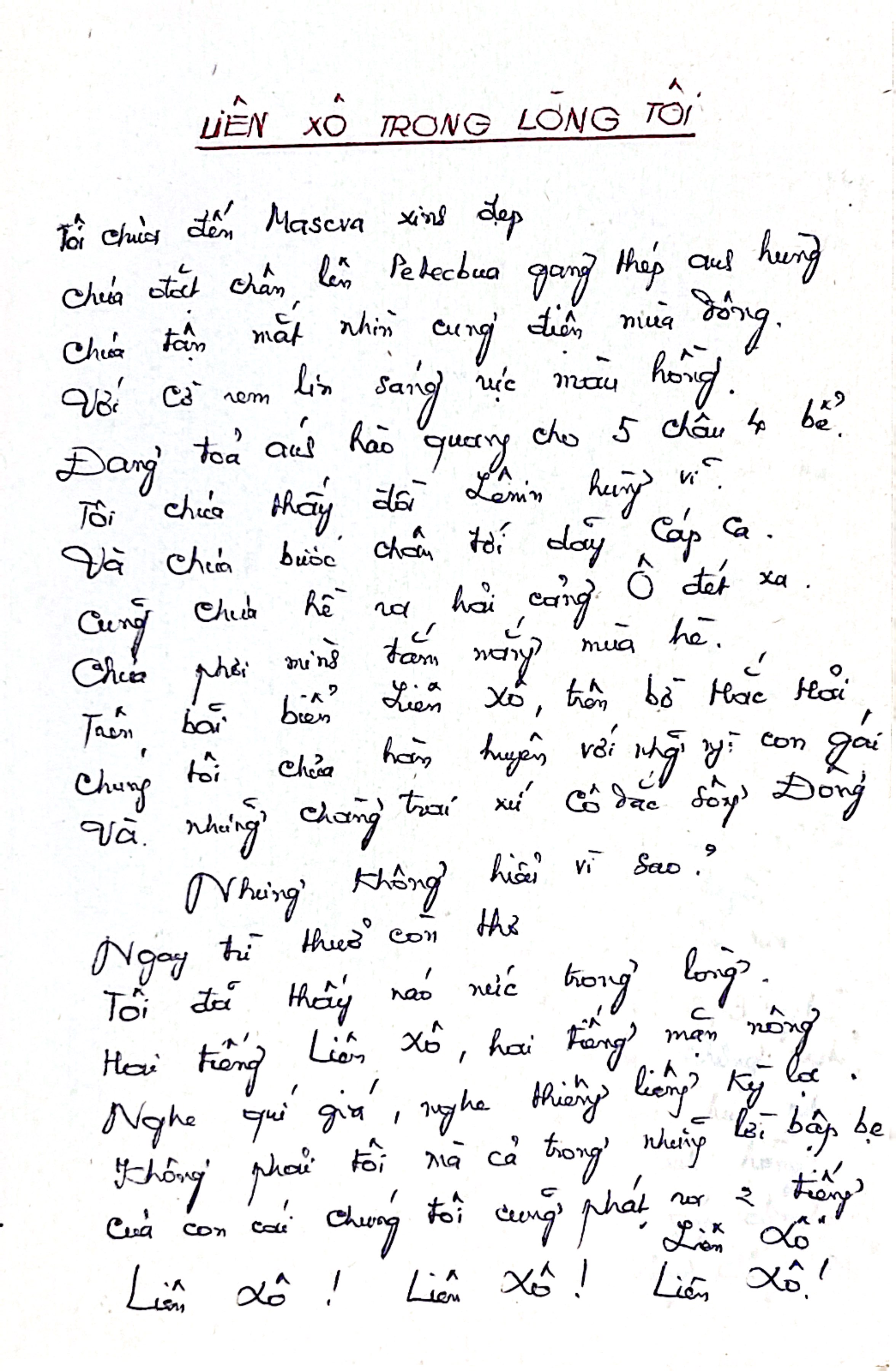 LIÊN XÔ TRONG LÒNG TÔI Tôi chưa đến Mátxcơva xinh đẹp Chưa đặt chân lên Pê-téc-bua gang thép anh hùng Chưa tận mắt nhìn Cung điện Mùa đông Với Crem-lin sáng rực màu hồng Đang tỏa ánh hào quang cho 5 châu 4 bể Tôi chưa thấy đồi Lênin hùng vĩ Và chưa bước chân tới dãy Cáp-ca Cũng chưa hề ra hải cảng Ô-đét-xa Chưa phơi mình tắm nắng mùa hè Trên bãi biển Liên Xô, trên bờ Hắc Hải Chúng tôi chưa hàn huyên với những người con gái Và những chàng trai xứ Cô Dắc sông Đông Nhưng không hiểu vì sao? Ngay từ thuở còn thơ Tôi đã thấy náo nức trong lòng Hai tiếng Liên Xô, hai tiếng mặn nồng Nghe quý giá, nghe thiêng liêng kỳ lạ Không phải tôi mà cả trong những lời bập bẹ Không phải tôi mà cả trong những lời bập bẹ Của con cái chúng tôi cũng phát ra 2 tiếng \"Liên Xô\" Liên Xô! Liên Xô! Liên Xô! Phải chăng đây nơi xuất phát ngọn cờ Là ngọn lửa là lò sinh cách mạng Năm 1917 tháng 10 đã giơ cao đuốc sáng Phá cường quyền, phá xiềng xích vùng lên Phải chăng đây có lãnh tụ Lênin Suốt cuộc đời chỉ vì nước vì dân Lo thực hiện giấc mơ Cộng sản Phải chăng đây những con người vô sản Đã vùng lên sống cuộc sống tự do Lấy bàn tay xây dựng lại cơ đồ Phải chăng đây từng phút từng giờ Cuộc sống đang của mình tiến lên, tiến mãi Nguyên tử, vệ tinh, những con tàu vĩ đại Đang lao nhanh vào vũ trụ bí huyền Rồi tàu phá băng nguyên tử Lênin Rồi những chiếc T.U tốc độ 2, 3 nghìn Chở hành khách xuyên đại châu không nghỉ Phải chăng đây chứa chan tình hữu nghị Với Việt Nam, với đất nước anh hùng? Phải chăng đây đã góp của góp công Giúp chúng ta, giúp thành đồng chống Mỹ Ôi đất nước Liên Xô, quê hương hùng vĩ Của tháng 10, của tháng 8 chúng ta Tuy chưa thấy mặt Người mà chúng tôi cảm thấy không xa Chưa được qua nước Người mà chúng tôi thấy thiết tha Nghe thân mến, nghe cảm tình vô hạn Dù trong khói bom hay trong lửa đạn Dù trên ruộng đồng hay trên trận tuyến xông pha Chúng tôi vẫn tiến vẫn nở nụ cười kiêu hãnh Chúng tôi vẫn tưởng như đang kề vai sát cánh Với Зôi-a, với Ma-tơ-rô-xốp anh hùng Dù có hy sinh, chúng tôi vẫn quyết xung phong Vẫn tiến bước, vẫn hăng hái lập chiến công Đưa đất nước chúng tôi Ngày mai thành Liên Xô rực rỡ Lạng Sơn Ngày 17-10-1967 (Sáng tác nhân dịp, thi đua chào mừng 50 năm Cách mạng Tháng 10 Nga)