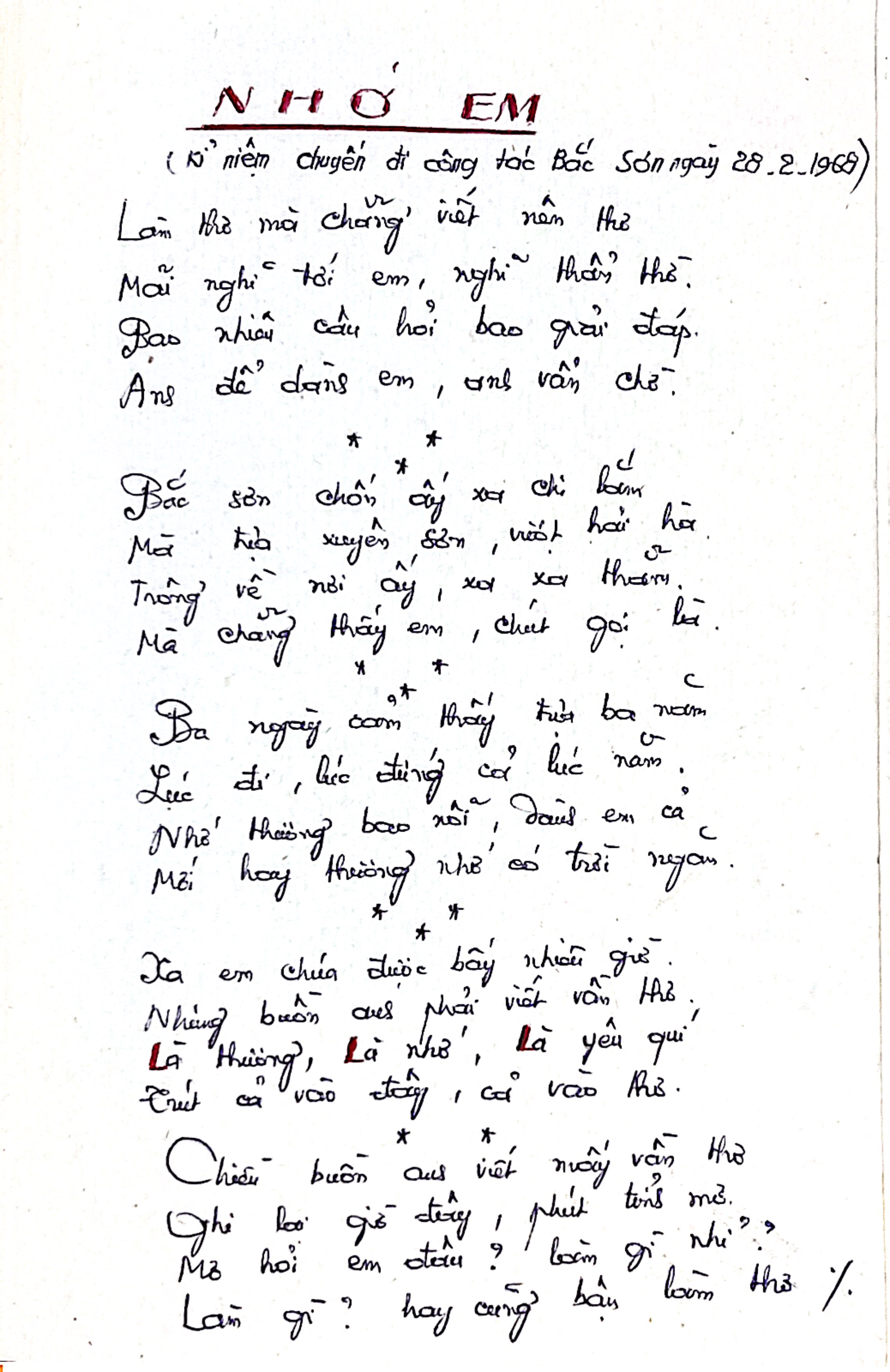 (kỷ niệm chuyến đi công tác Bắc Sơn ngày 28.2.1968) Làm thơ mà chẳng viết nên thơ Mãi nghĩ tới em, nghĩ thẫn thờ. Bao nhiêu câu hỏi bao giải đáp. Anh để dành em, anh vẫn chờ. * * * Bắc Sơn chốn ấy xa chi lắm Mà tựa xuyên sơn, vượt hải hà Trông về nơi ấy xa xa thẳm. Mà chẳng thấy em, chút gọi là. * * * Ba ngày cảm thấy tựa ba năm Lúc đi, lúc đứng cả lúc nằm; Nhớ thương bao nỗi, dành em cả Mới hay thương nhớ có trời ngăn. * * * Xa em chưa được bấy nhiêu giờ. Nhưng buồn ơi phải viết vần thơ Là tương, Là nhớ, Là yêu quí Trút ra vào đây, cả vào thơ. * * * Chiều buồn anh viết mấy vần thơ Ghi lại giờ đây, phút tỉnh mơ. Mà hỏi em đâu? Làm gì nhỉ? Làm gì? hay cũng bận làm thơ ./.