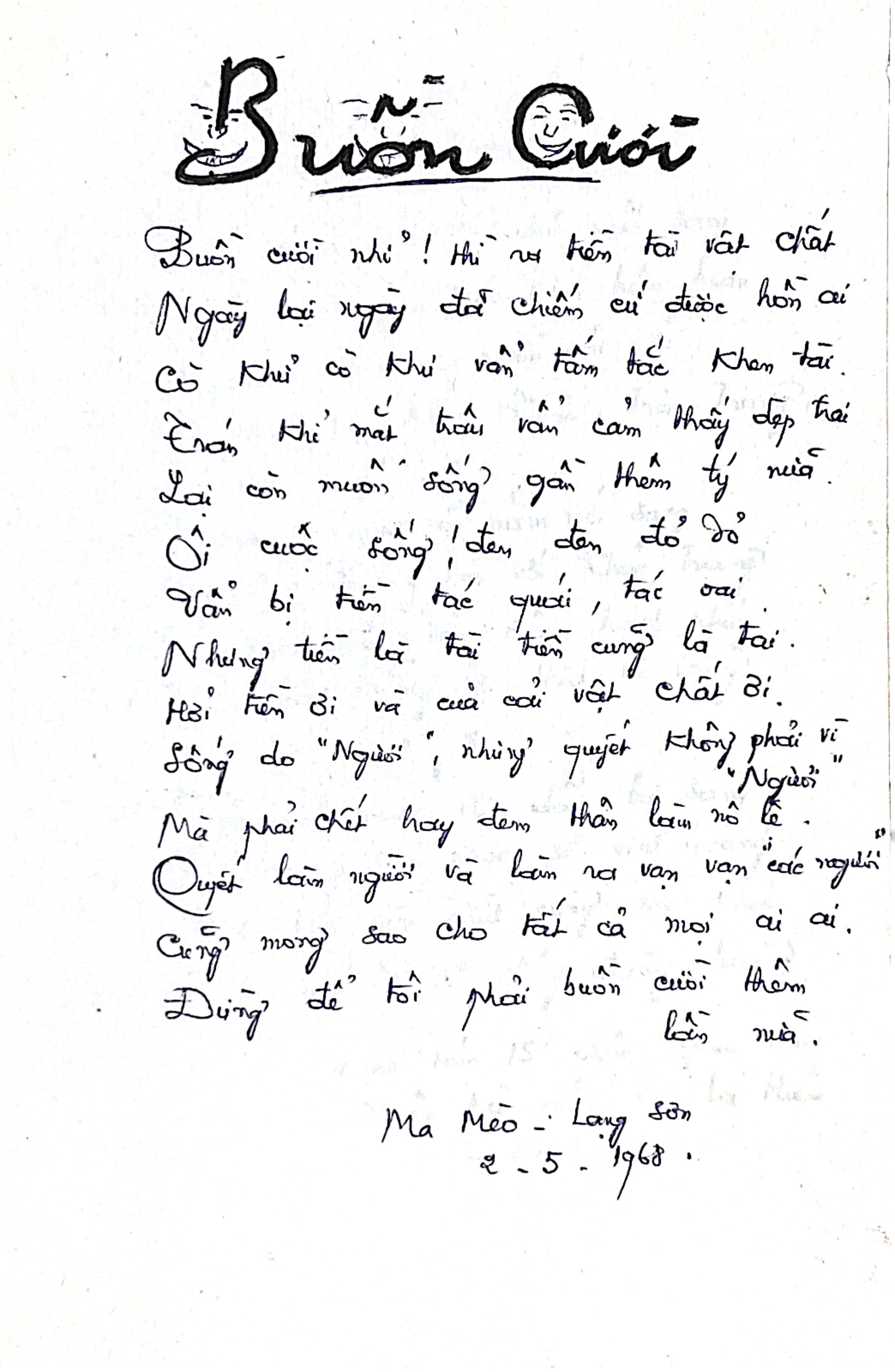 BUỒN CƯỜI Buồn cười nhỉ! Thì ra tiền tài vật chất Ngày lại ngày đã chiếm cứ được hồn ai Cò khử cò khư vẫn tấm tắc khen tài. Trán khỉ mắt trâu vẫn cảm thấy đẹp trai Lại còn muốn sống gần thêm tý nữa. Ôi cuộc sống! đen đen đỏ đỏ Vẫn bị tiền tác quái, tác oai Nhưng tiền là tài, tiền cũng là tai. Hỡi tiền ơi và của cải vật chất ơi. Sống do "Người", nhưng quyết không phải vì "Người" Mà phải chết hay đem thân làm nô lệ. Quyết làm người và làm ra vạn vạn "các ngươi" Cũng mong sao cho tất cả mọi ai ai. Đừng để tôi phải buồn cười thêm lần nữa. Ma Mèo - Lạng Sơn 02.05.1968