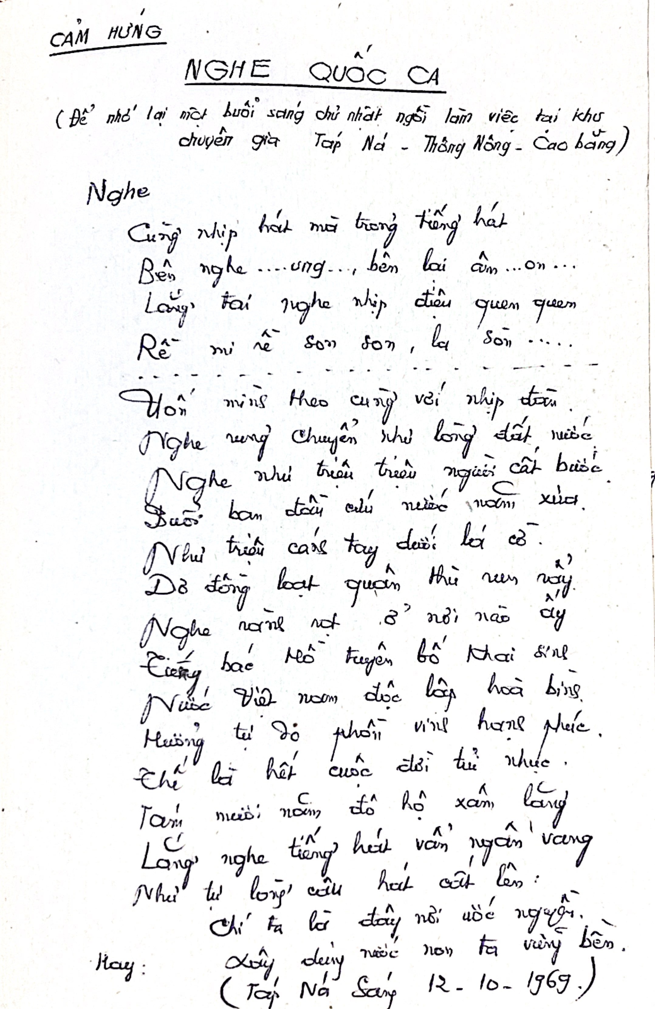 CẢM HỨNG NGHE QUỐC CA (Để nhớ lại một buổi sáng chủ nhật ngồi làm việc tại khu chuyên gia Táp Ná - Thông Nông - Cao Bằng) Nghe cùng nhịp hát mà tưởng tiếng hát Bên nghe ... ung ..., bên lại âm ... on ... Lắng tai nghe nhịp điệu quen quen Rề mi rề son son, la son ..... Uốn mình theo cùng với nhịp đầu Nghe rung chuyển như lòng đất nước Nghe như triệu triệu người cất bước Buổi ban đầu cứu nước năm xưa Như triệu cánh tay dưới lá cờ Giơ đồng loạt quân thù run rẩy Nghe rành rọt ở nơi nào ấy Tiếng Bác Hồ tuyên bố khai sinh Nước Việt nam độc lập hoà bình Hưởng tự do phồn vinh hạnh phúc Thế là hết cuộc đời tủi nhục Tám mươi năm đô hộ xâm lăng Lắng nghe tiếng hát vẫn ngân vang Như tự lòng câu hát cất lên: Chí ta là đây nơi ước nguyện Hay: Xây dựng nước non ta vững bền. (Táp Ná sáng 12-10-1969)