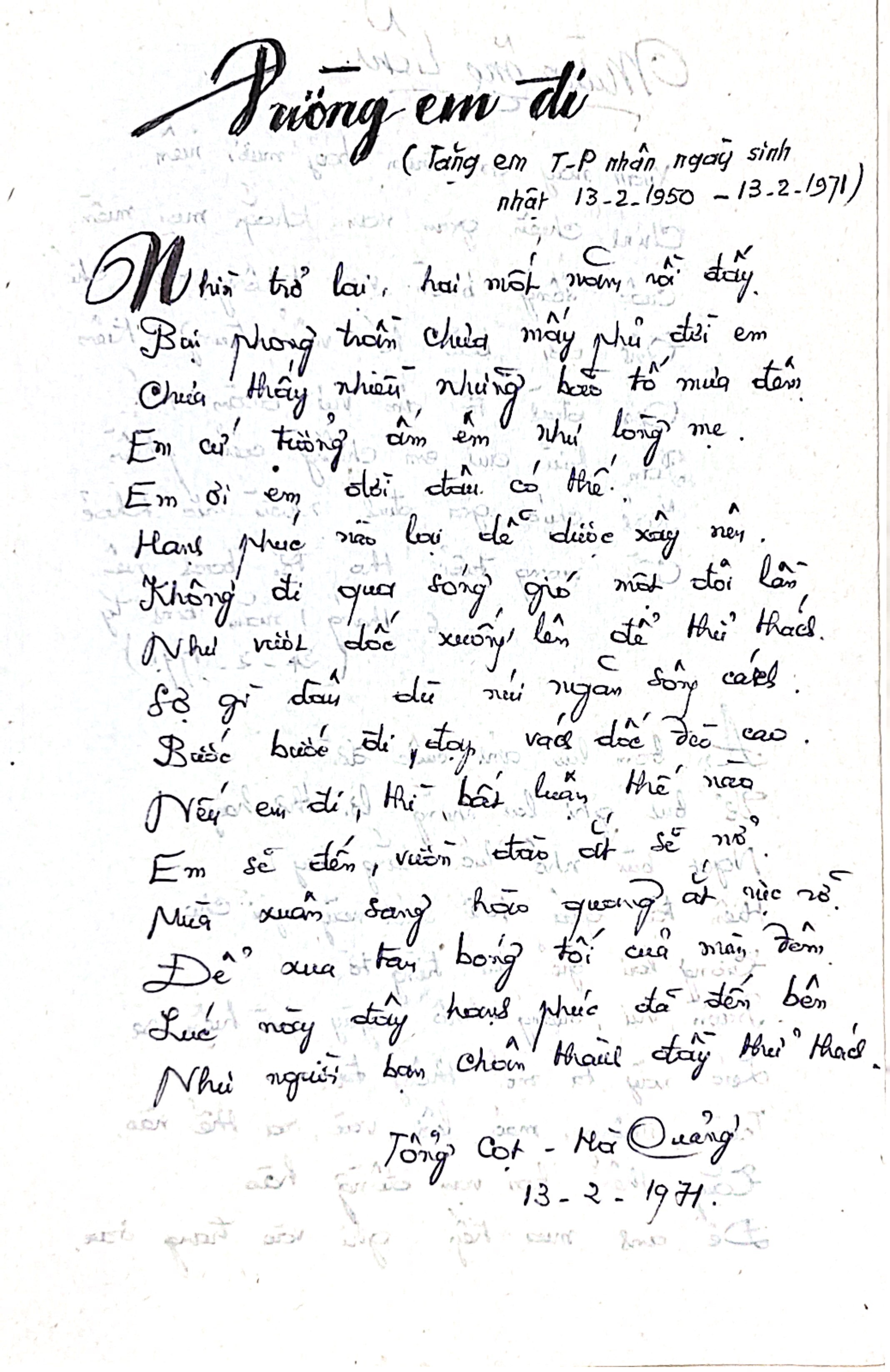 Đường Em Đi (Tặng em T.P nhân ngày sinh nhật 13-2-1950 - 13-2-1971) Nhìn trở lại, hai mốt năm rồi đấy. Bụi phong trần chưa mấy phủ đời em Chưa thấy nhiều những bão tố mưa đêm. Em cứ tưởng ấm êm như lòng mẹ. Em ơi em, đời đâu có thế. Hạnh phúc nào lại dễ được xây nên. Không đi qua sóng gió một đôi lần Như vượt dốc xuống lên để thử thách. Sợ gì đâu dù núi ngăn sông cách. Nếu em đi, thì bất luận thế nào. Nếu em đi thì bãi lúa thế nào? Em sẽ đến vườn đào ắt sẽ nở, Mùa xuân sang hào quang ắt rực rỡ. Để xua tan bóng tối của màn đêm. Lúc này đây hạnh phúc đã đến bên Như người bạn chân thành đầy thử thách! Tổng Cọt - Hà Quảng 13-02-1971