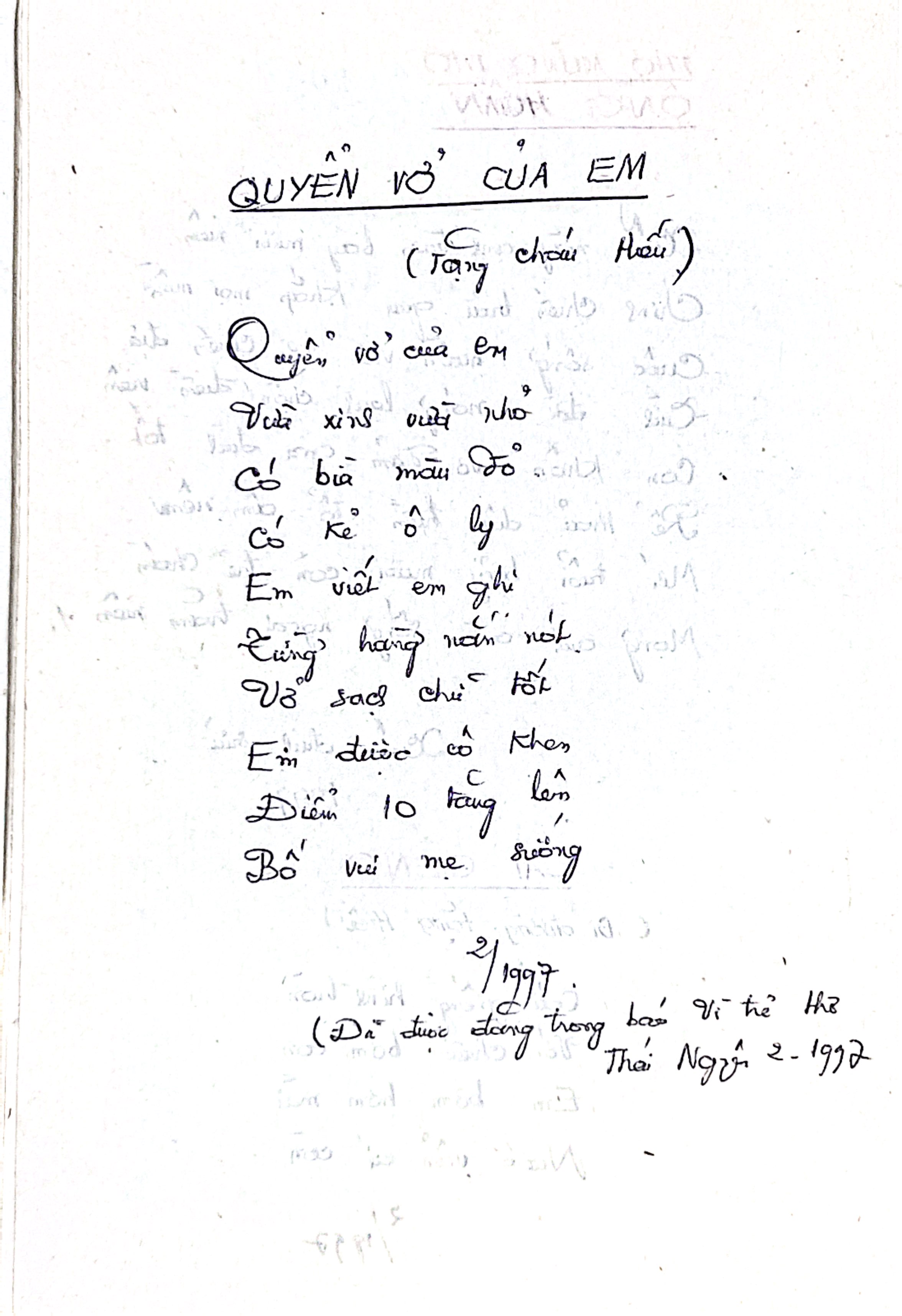 (Tặng cháu Hiếu) Quyền vở của em Vừa xinh vừa nhỏ Có bìa màu đỏ Có kẻ ô ly Em viết em ghi Từng hàng nắn nót Vở sạch chữ tốt Em được cô khen Điểm 10 tăng lên Bố vui mẹ sướng 2/1997 (Đã được đăng trong báo Vì Trẻ Thơ Thái Nguyên 2/1997)