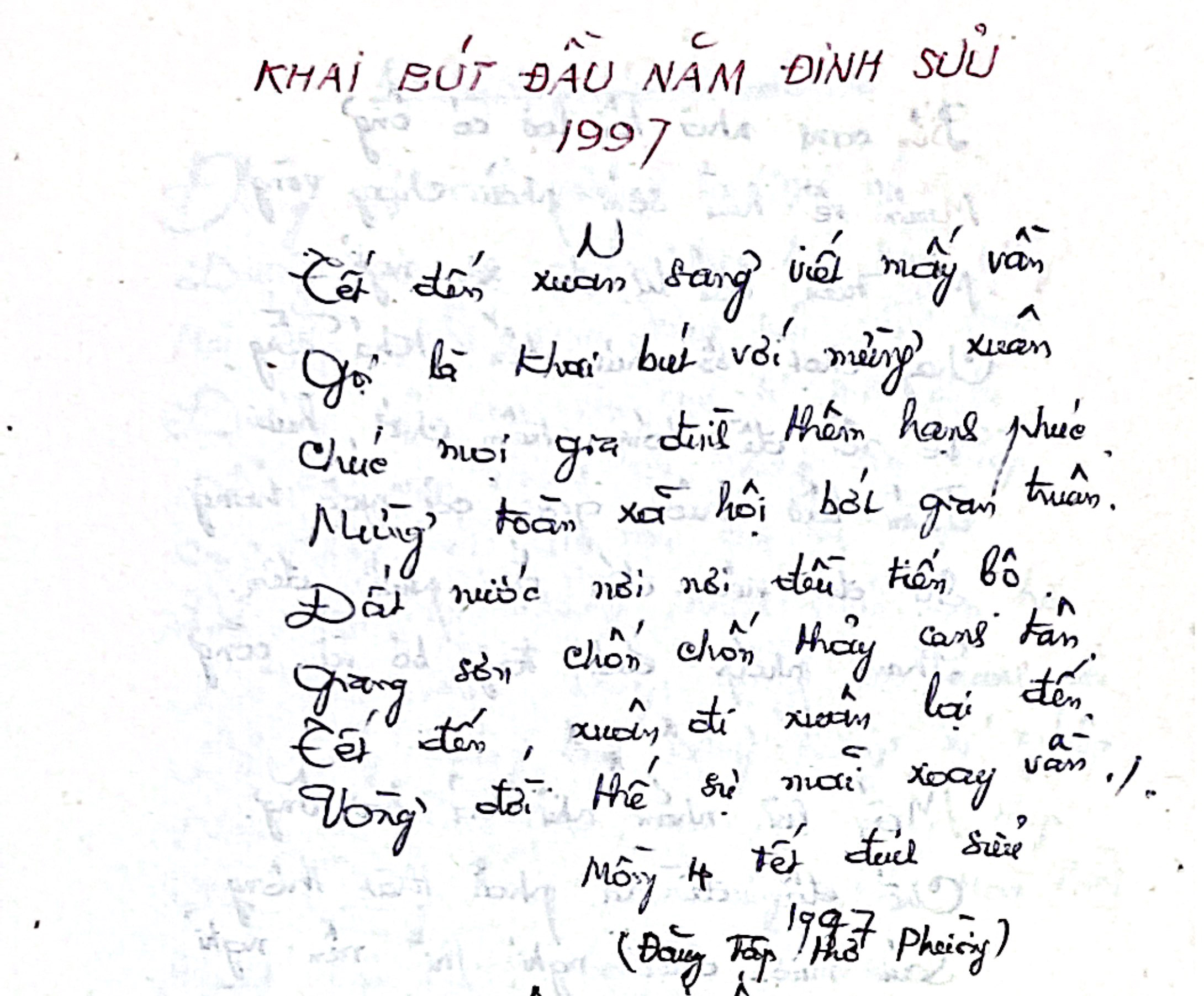 KHAI BÚT ĐẦU NĂM ĐINH SỬU 1997 Tết đến xuân sang viết mấy vần Gọi là khai bút với mừng xuân Chúc mọi gia đình thêm hạnh phúc Mừng toàn xã hội bớt gian truân Đất nước nơi nơi đều tiến bộ Giang sơn chốn chốn thảy canh tân Tết đến, xuân đi xuân lại đến Vòng đời thế sự mãi xoay vần./. Mồng 4 Tết Đinh Sửu 1997 (Đăng tập thơ phường)