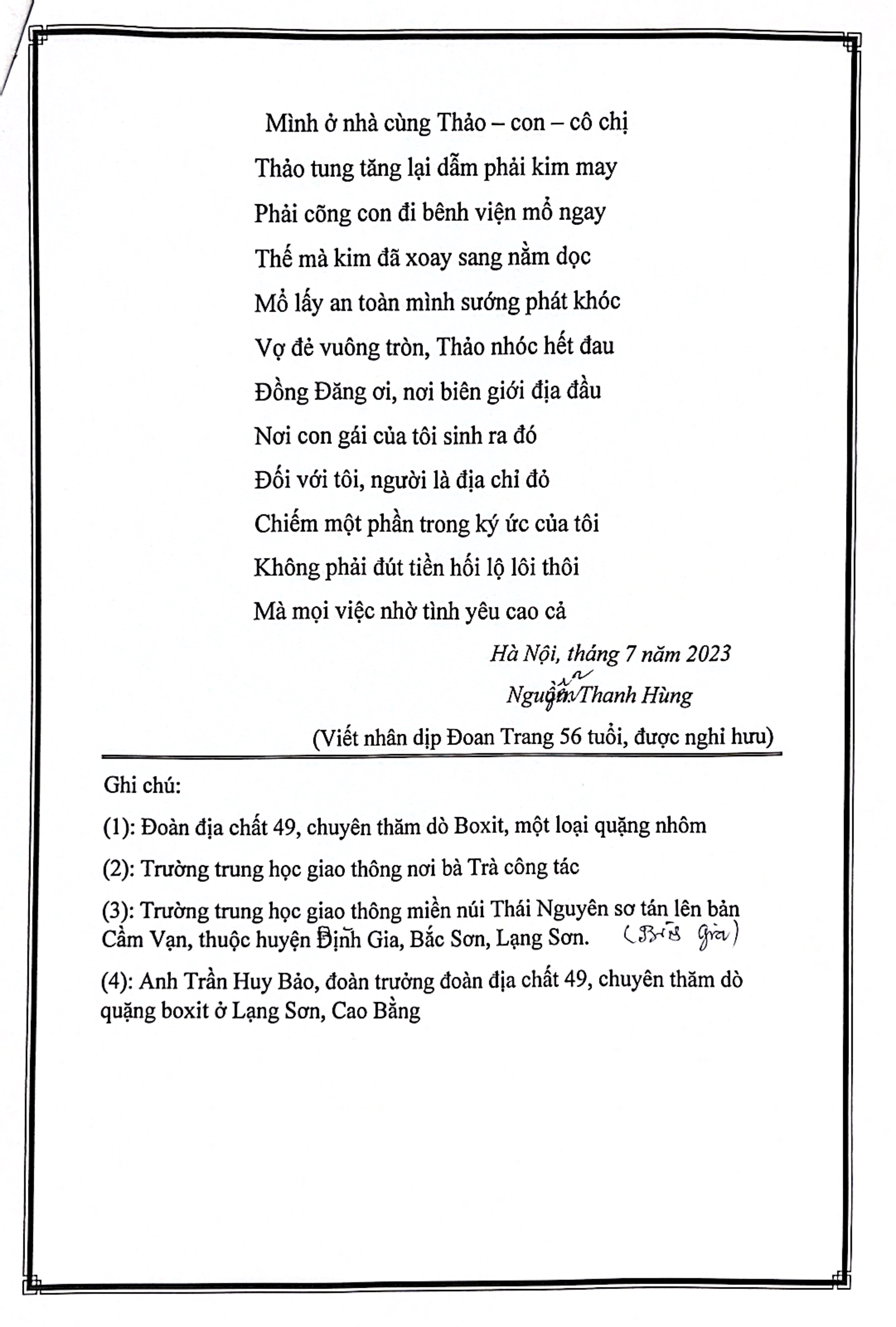 Ngồi nhớ lại năm mươi sáu năm trước Khi đóng quân trên đất Lạng - Ma Mèo Nơi núi đồi vách đá khắc cheo leo Lại giáp biên với nước Tàu xấc xược. Đoàn 49 vẫn kiên cường tiến bước Tìm quặng nhôm theo tổ quốc yêu cầu Trường giao thông của bà lại ở đâu đâu Dưới huyện Bình Gia, Bắc Sơn lịch sử. Lúc này bà lại báo ngày ở cữ Đứa con thứ hai sắp đến ngày sinh Công việc này vợ không thể một mình Nên phải theo chồng lên đoàn địa chất. Đương nhiên rồi có biết bao chật vật Cơm, áo, gạo, tiền thường nhật chăm lo Nhất lại ở nơi “cò gáy, khỉ ho” Núi Ma Mèo, đất nghèo xứ Lạng. Nhưng hết tối tăm mặt trời ló rạng Anh Bảo trưởng đoàn giúp đỡ, yêu thương Nên mọi việc cũng cảm thấy bình thường Nhất là khi đạn bom quân xâm lược. Trút xuống hàng ngày, quê không ra được Phải tự mình xoay xở với vợ con Tối 5 tháng 7 sinh nở vuông tròn Tám giờ đêm cùng hộ sinh, bác sĩ. Mình ở nhà cùng Thảo - con - cô chị Thảo tung tăng lại dẫm phải kim may Phải công con đi bệnh viện mổ ngay Thế mà kim đã xoay sang nằm dọc Mổ lấy an toàn mình sướng phát khóc. Vợ đẻ vuông tròn, Thảo nhóc hết đau Đồng Đăng ơi, nơi biên giới địa đầu Nơi con gái của tôi sinh ra đó Đối với tôi, người là địa chỉ đỏ. Chiếm một phần trong ký ức của tôi Không phải đút tiền hối lộ lôi thôi Mà mọi việc nhờ tình yêu cao cả. Hà Nội, tháng 7 năm 2023 Nguyễn Thanh Hùng (Viết nhân dịp Đoan Trang 56 tuổi, được nghỉ hưu) ------------------- Ghi chú: (1) Đoàn địa chất 49, chuyến thăm dò Boxit, một loại quặng nhôm (2) Trường trung học giao thông nơi bà Trà công tác (3) Trường trung học giao thông miền núi Thái Nguyên sơ tán lên bản Cẩm Vạn, thuộc huyện Bình Gia, Bắc Sơn, Lạng Sơn. (4) Anh Trần Huy Bảo, đoàn trưởng đoàn địa chất 49, chuyến thăm dò quặng boxit ở Lạng Sơn, Cao Bằng.