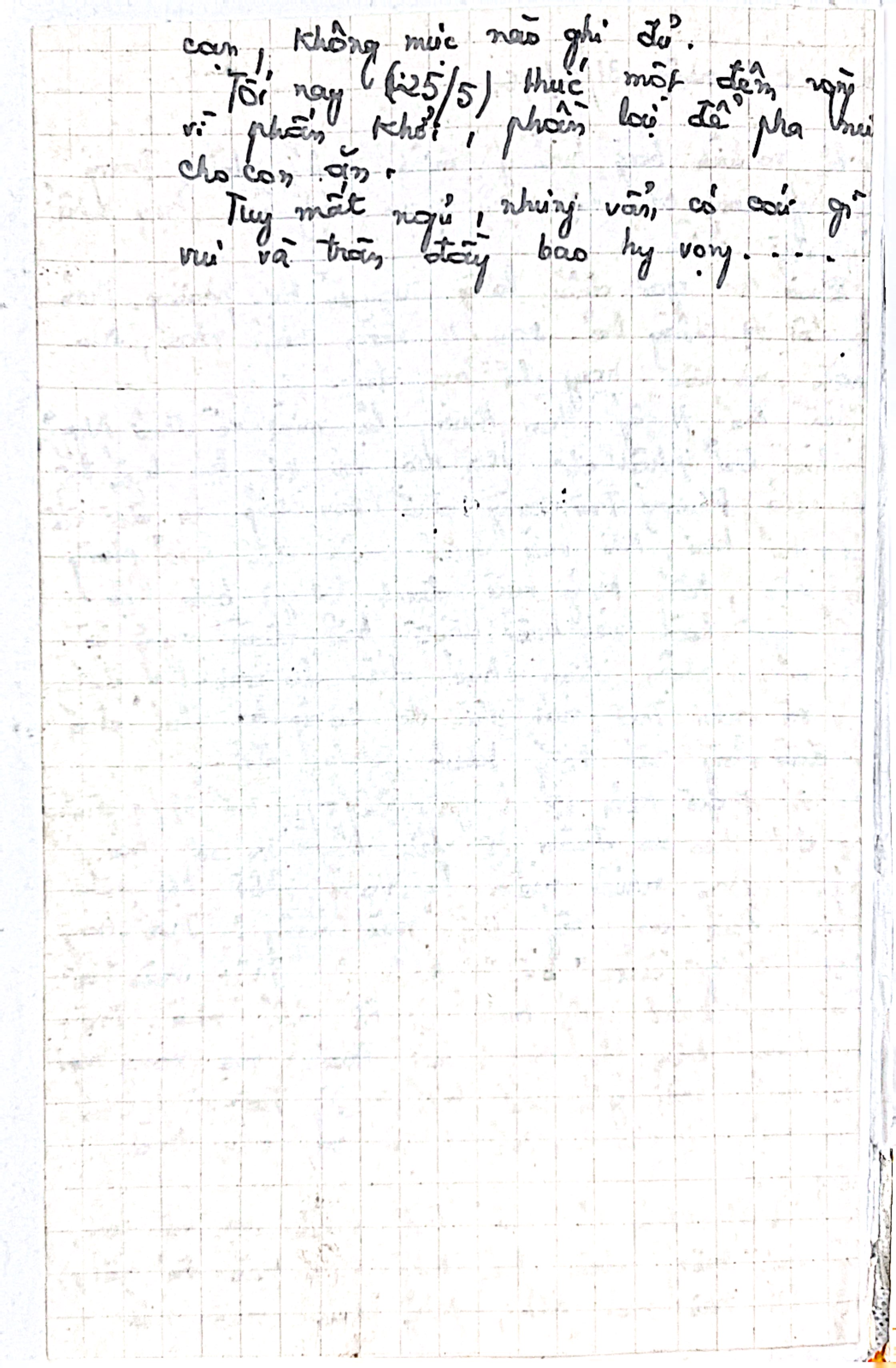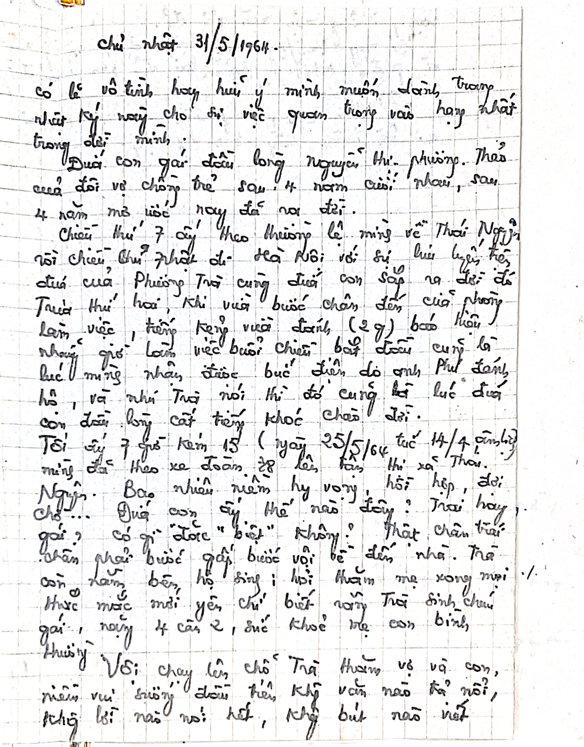 Chủ nhật 31/5/1964, Có lẽ vô tình hay hữu ý mình muốn dành trang nhật ký này cho việc quan trọng vào hàng nhất trong đời mình. Đứa con gái đầu lòng Nguyễn Thị Phương Thảo của đôi vợ chồng trẻ sau 4 năm cưới nhau, sau 4 năm mơ ước nay đã ra đời. Chiều hôm thứ 7 ấy theo thường lệ mình về Thái Nguyên, rồi chiều chủ nhật đi Hà Nội với sự lưu luyến tiễn đưa của Phương Trà cùng đứa con sắp ra đời đó. Trưa thứ hai, khi vừa bước chân đến cửa phòng làm việc, tiếng kẻng vừa đánh (2 giờ) báo hiệu những giờ làm việc buổi chiều bắt đầu cũng là lúc mình nhận được bức điện do anh Phú đánh hộ, và như Trà nói thì đó cũng là lúc đứa con đầu lòng cất tiếng khóc chào đời. Tối ấy, 7 giờ kém 15 (ngày 25/5/64 tức 14/4 âm lịch) mình đã theo xe đoàn 8 lên tận Thị xã Thái Nguyên. Bao nhiêu niềm hy vọng, hồi hộp, đợi chờ... Đứa con ấy. Thế nào đây? Trai hay gái? Có gì \"đặc biệt\" không? Thật, chân trái chân phải bước gấp bước vội về đến nhà. Trà còn nằm bên hộ sinh; hỏi thăm mẹ xong mọi thắc mắc mới yên chí biết rằng Trà sinh cháu gái, nặng 4 cân 2, sức khoẻ mẹ con bình thường. Vội chạy lên chỗ Trà thăm vợ và con, niềm vui sướng đầu tiên không văn bào tả nổi, không lời nào nói hết, không bút nào viết cạn, không mực nào ghi đủ. Tối nay (25/5) thức một đêm ròng vì phấn khởi, phần lại để pha sữa cho con ăn. Tuy mất ngủ, nhưng vẫn có cái gì vui và tràn đầy bao hy vọng...