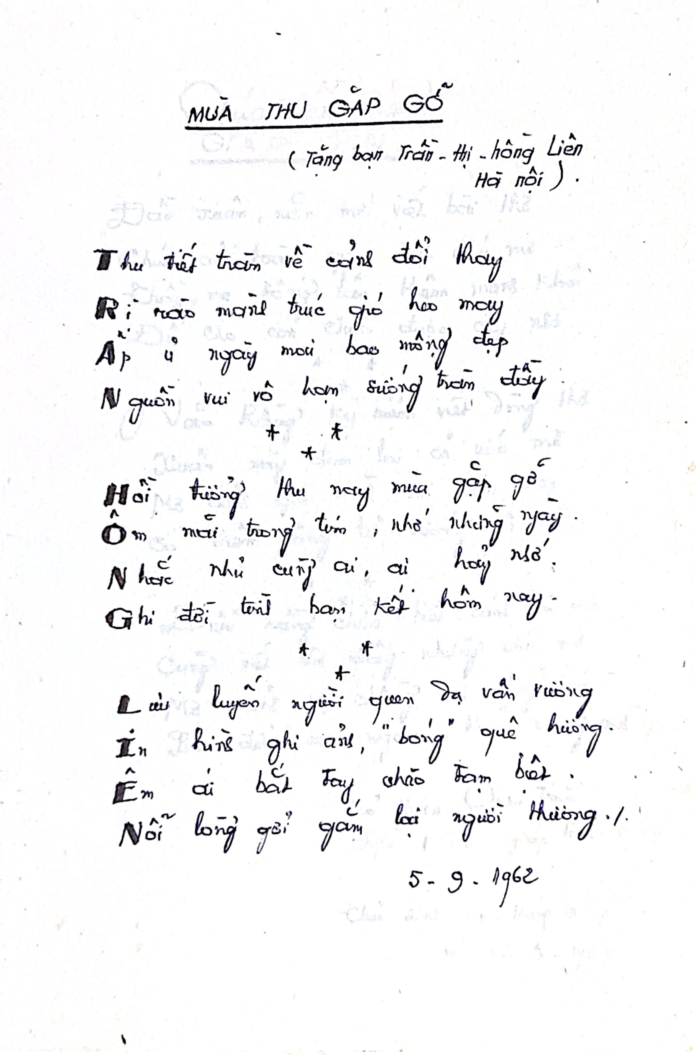 (Tặng bạn Trần-thị-Hồng Liên Hà nội). Thu tiết tràn về cảnh đổi thay Rì rào mành trúc gió heo may Ấp ủ ngày mai bao mộng đẹp Nguồn vui vô hạn sướng tràn đầy. * * * Hồi tưởng thu nay mùa gặp gỡ Ôm mai trông tim, nhớ những ngày. Nhắn nhủ cùng ai, ai hay nhớ Ghi đời tình bạn kết hôm nay. * * * Lưu luyến người quen dạ vấn vương In hình ghi ảnh, \"bóng\" quê hương. Êm ái bắt tay, chào tạm biệt. Nỗi lòng gởi gắm hai người thương./. 5-9-1962